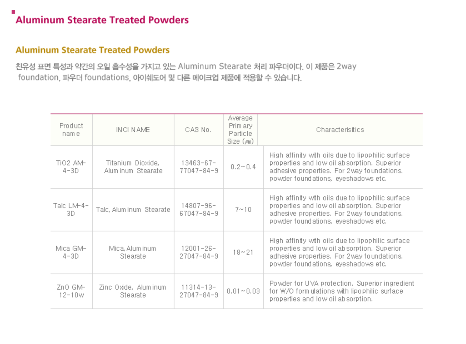 친유성 표면 특성과 약간의 오일 흡수성을 가지고 있는 Aluminum Stearate 처리 파우더이다. 이 제품은 2way foundation, 파우더 foundations, 아이쉐도어 및 다른 메이크업 제품에 적용할 수 있습니다.