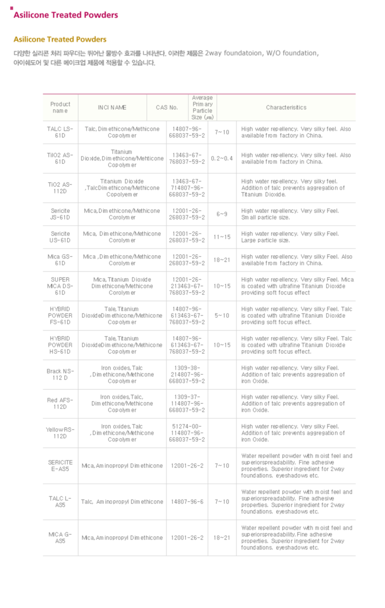 다양한 실리콘 처리 파우더는 뛰어난 물방수 효과를 나타낸다. 이러한 제품은 2way foundatoion, W/O foundation, 아이쉐도어 및 다른 메이크업 제품에 적용할 수 있습니다.