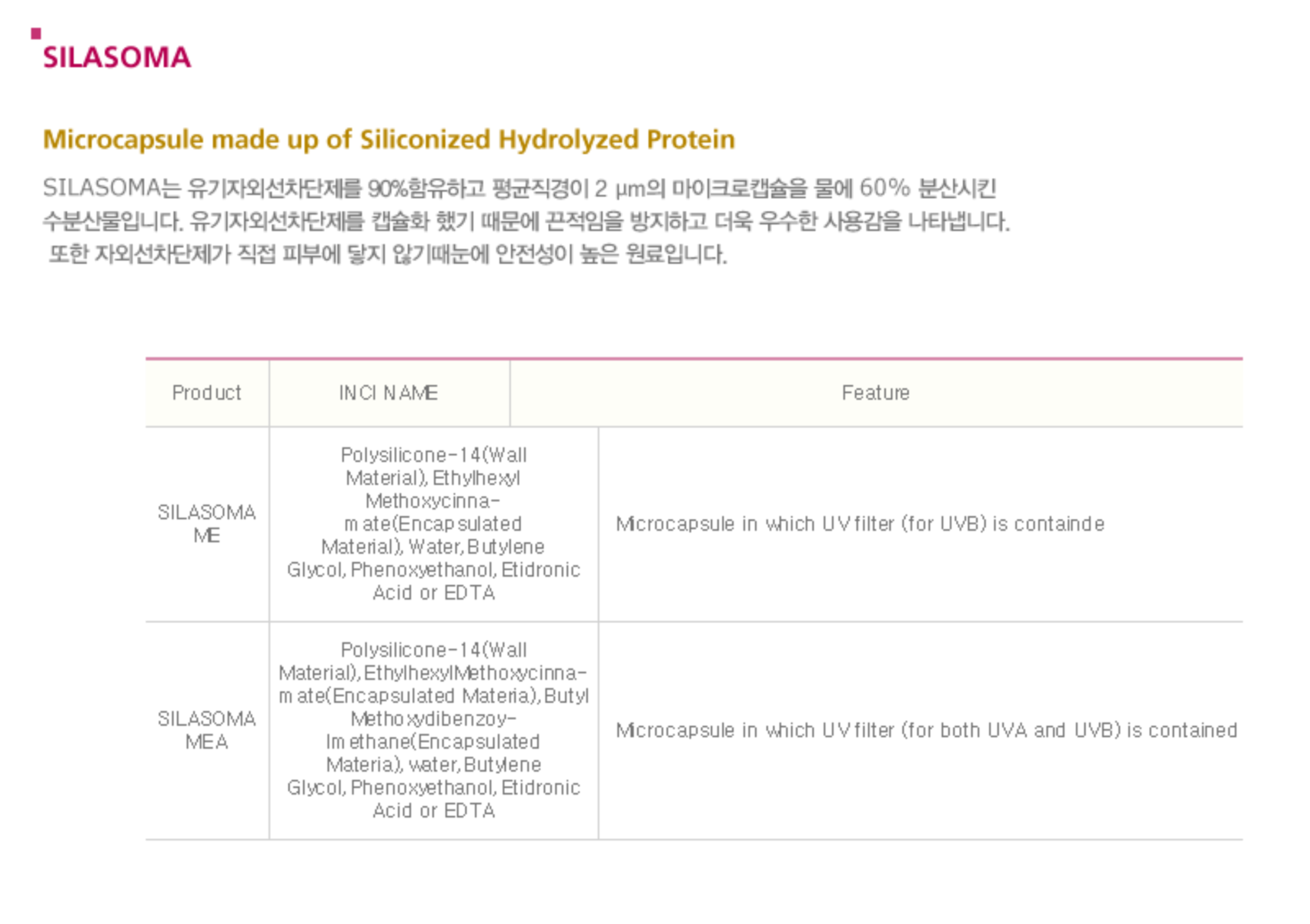 SILASOMA는 유기자외선차단제를 90%함유하고 평균직경이 2 μm의 마이크로캡슐을 물에 60% 분산시킨 수분산물입니다. 유기자외선차단제를 캡슐화 했기 때문에 끈적임을 방지하고 더욱 우수한 사용감을 나타냅니다. 또한 자외선차단제가 직접 피부에 닿지 않기때눈에 안전성이 높은 원료입니다.