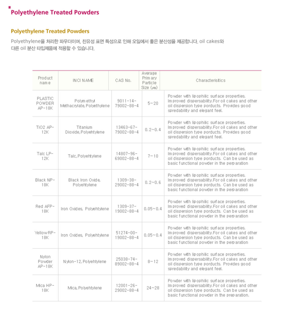Polyethylene을 처리한 파우더이며, 친유성 표면 특성으로 인해 오일에서 좋은 분산성을 제공합니다. oil cakes와 다른 oil 분산 타입제품에 적용할 수 있습니다.