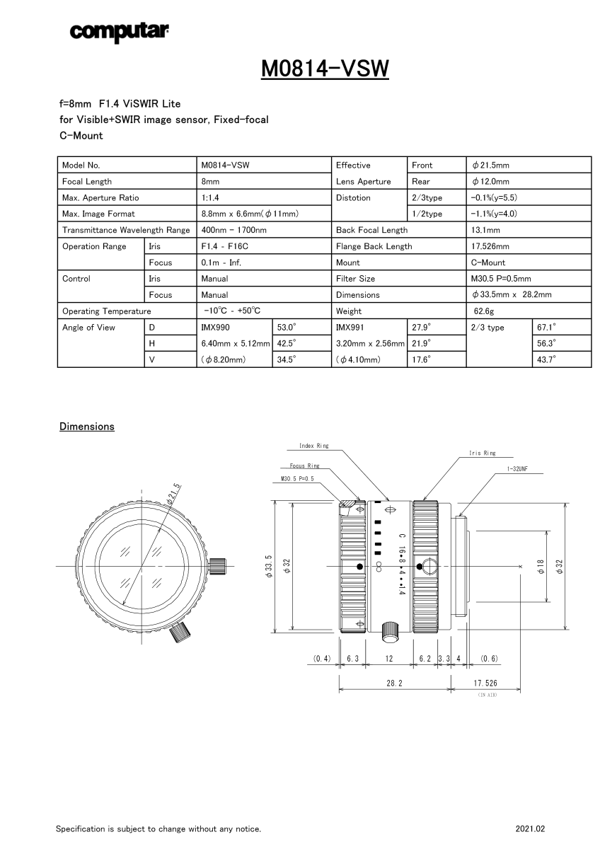 • Visible+SWIR / SWIR Lens